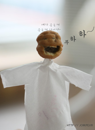 호두과자 먹다가 문득 보니 이 모양. 신기하고 웃겨서 스트로우에 꽂아서 사진을 찍고... . . . . . . . . . . 대가리를 홀라당 먹어 버렸다. 이 잔인한 인간아...- -+